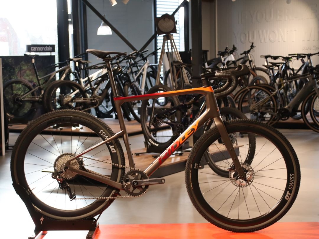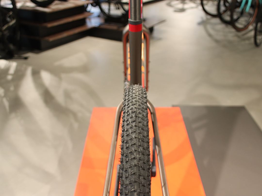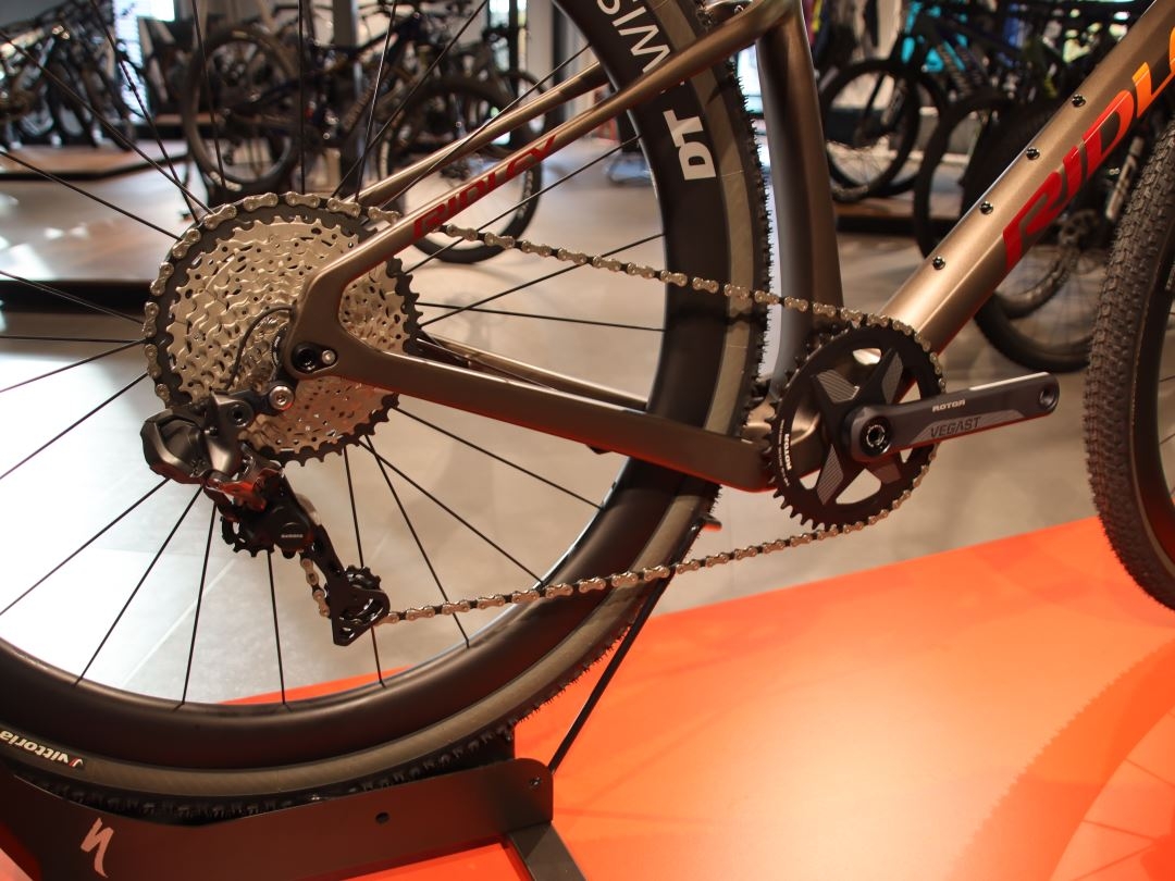 Deze fiets is uitgerust met de Shimano GRX800 Di2 1x11sp groepset, inclusief een Shimano GRX 817 Di2 achterderailleur en een Rotor Vegast crankset met een 42T kettingblad. De Shimano XT M8000 cassette heeft een bereik van 11-42T. Voor en achter wielen zijn DT Swiss GRC1400 Dicut, Tubeless Ready, en bieden uitstekende grip en stabiliteit. De Vittoria Mezcal TNT banden van 700x44c zorgen voor perfecte tractie op gravel en ruw terrein.