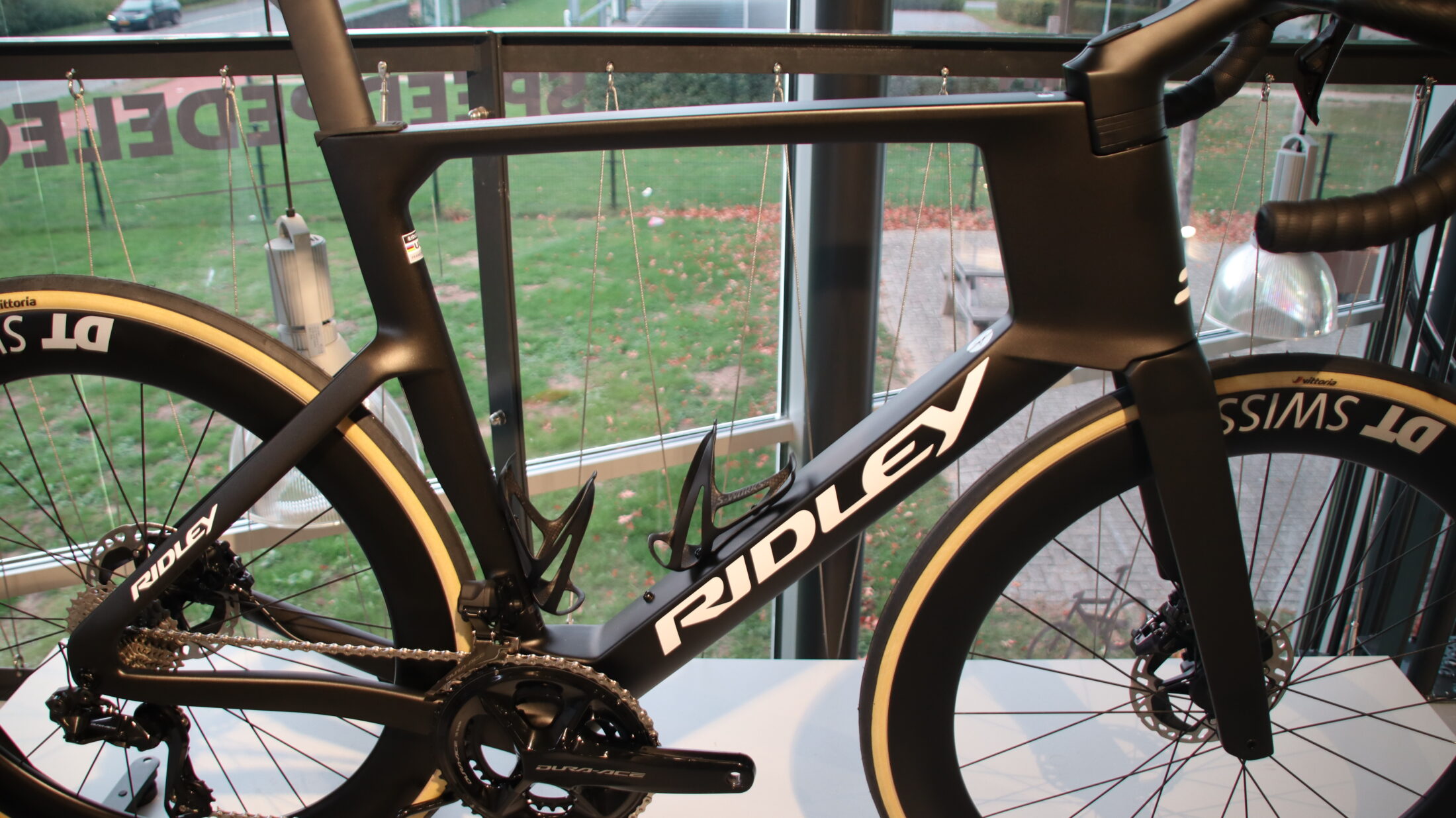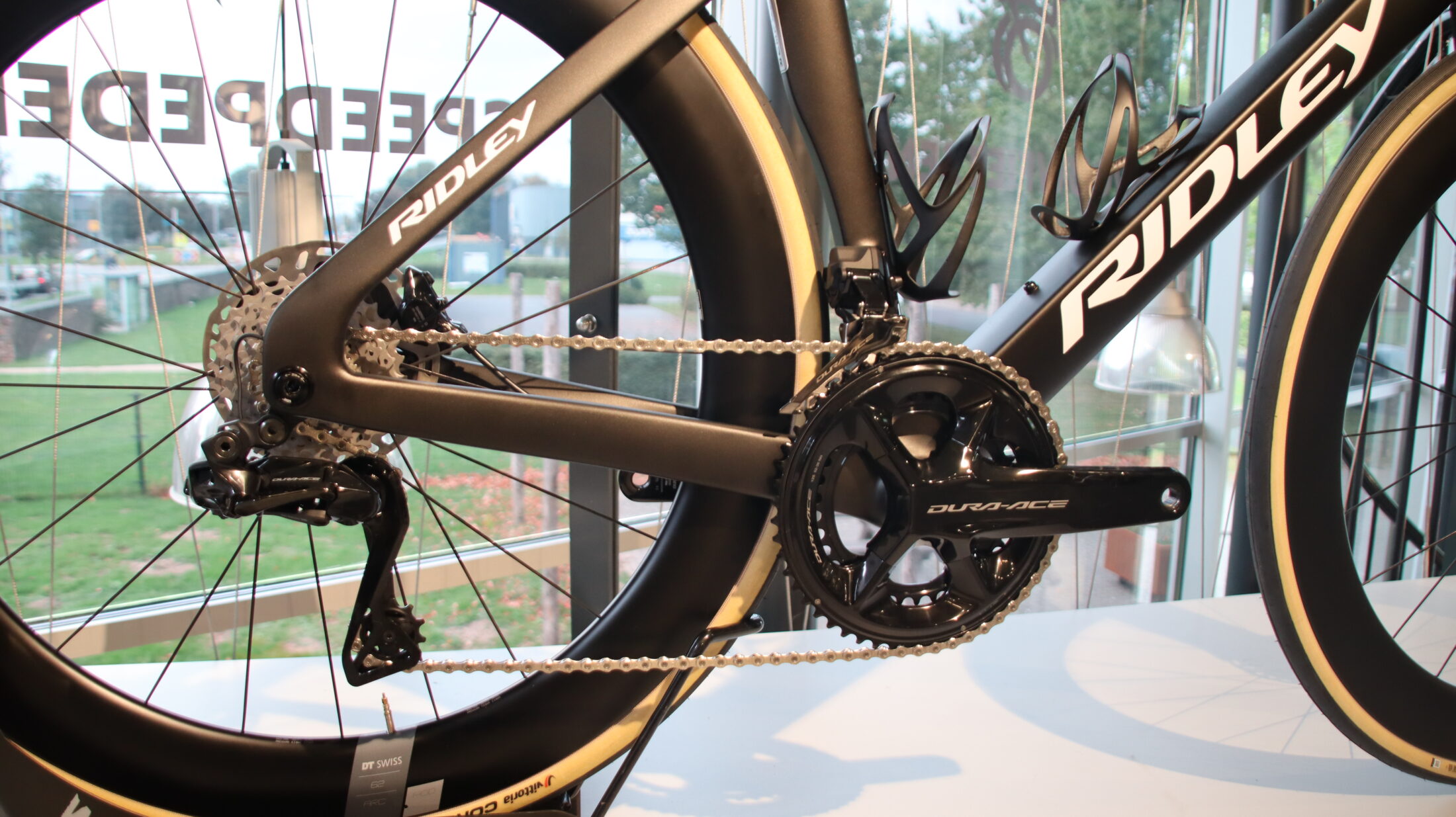 Ridley Noah Fast in maat L. Deze volledig uit carbon opgebouwde aero-racefiets is afgemonteerd met Shimano Dura-Ace Di2 2×12 elektronische schakeling, wat zorgt voor uiterst nauwkeurige en snelle schakelprestaties. De fiets is uitgerust met DT Swiss ARC 1400 wielen die gecombineerd zijn met DT Swiss 240 naven, bekend om hun duurzaamheid en lage weerstand. Voor extra comfort en prestatie zit er een Selle Italia SLR 3D zadel op, gemonteerd op een carbon zadelpen die de aerodynamische en lichte opbouw van de fiets versterkt. Deze fiets is ontworpen om snelheid, stijfheid en efficiëntie te combineren en is daarmee ideaal voor fanatieke wielrenners die hoge eisen stellen aan hun materiaal. Er is nog nooit op deze fiets gereden, waardoor hij volledig nieuw is en zich in perfecte staat bevindt.