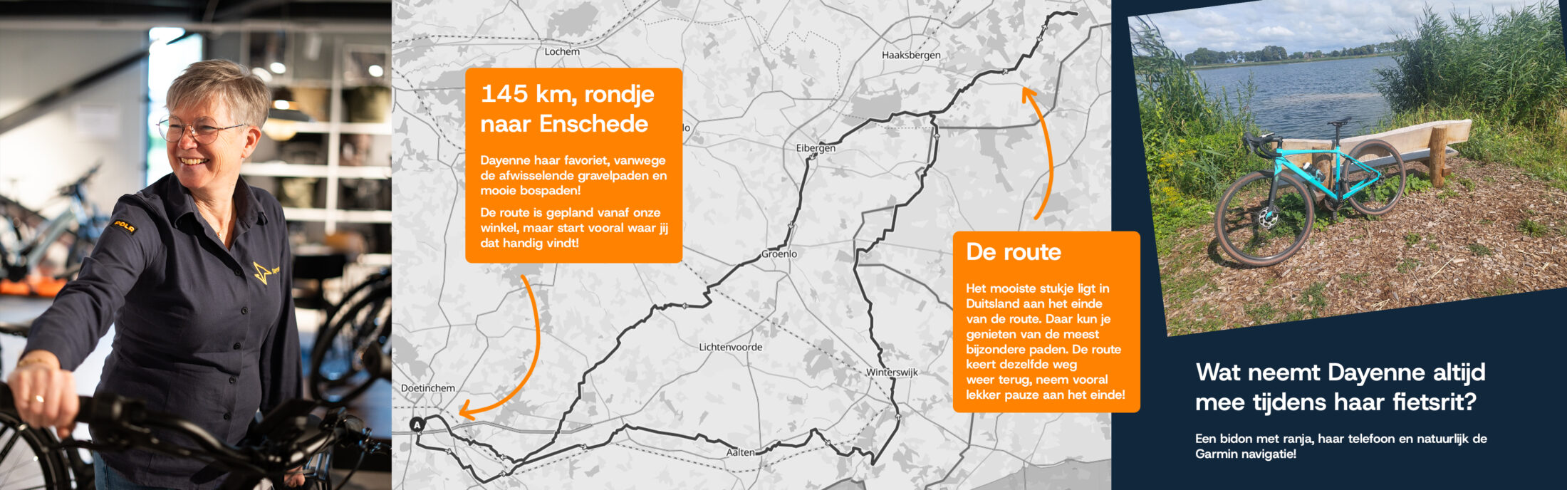 Dayenne is onze specialist als het gaat om bakfietsen en e-bikes. Maar wat niet iedereen weet: ze is ook een fanatiek gravelrijder. Op haar blauwe Bianchi Impulso Allroad maakt ze heel wat kilometers. De favoriete route van Dayenne? Richting Enschede, een stukje over de grens én weer terug.